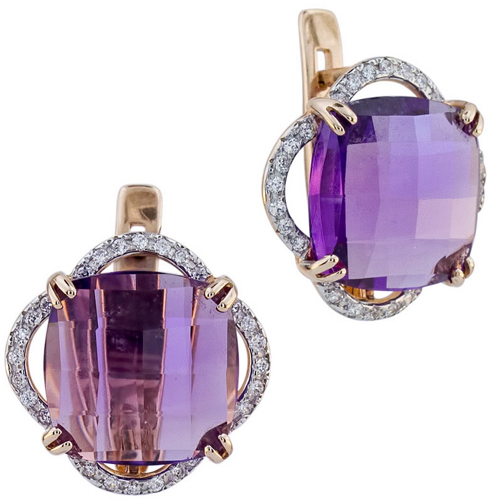 Серьги 120АКц выполнены из золота 585 пробы и украшены натуральными вставками: 2 Аметист бриолет антик 12 мм на 12 мм, вес 10.68 карат